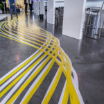 Die Linienführung führte die Besucher:innen durch den Raum, strukturierte die Eventfläche und setzte zugleich einen starken visuellen Akzent. Die Bodengestaltung wirkte aus der Distanz grafisch klar, entfaltete ihre Wirkung aber besonders im Durchlaufen des Raumes – typisch für Tape Art als raumbezogenes Medium.