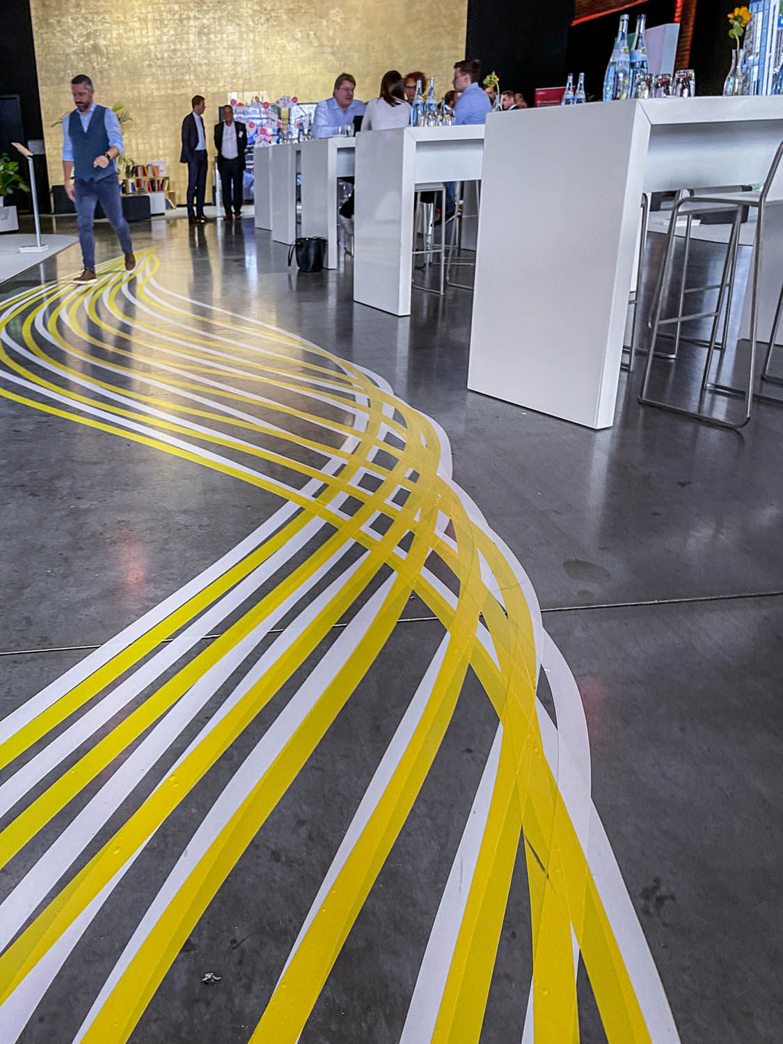Die Linienführung führte die Besucher:innen durch den Raum, strukturierte die Eventfläche und setzte zugleich einen starken visuellen Akzent. Die Bodengestaltung wirkte aus der Distanz grafisch klar, entfaltete ihre Wirkung aber besonders im Durchlaufen des Raumes – typisch für Tape Art als raumbezogenes Medium.