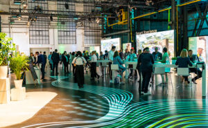 Tape Art Bodengestaltung für Fujitsu Smart Solutions: geschwungene Linien als visuelle Verbindung von Digitalisierung, Wachstum und Vernetzung. By DUMBO AND GERALD