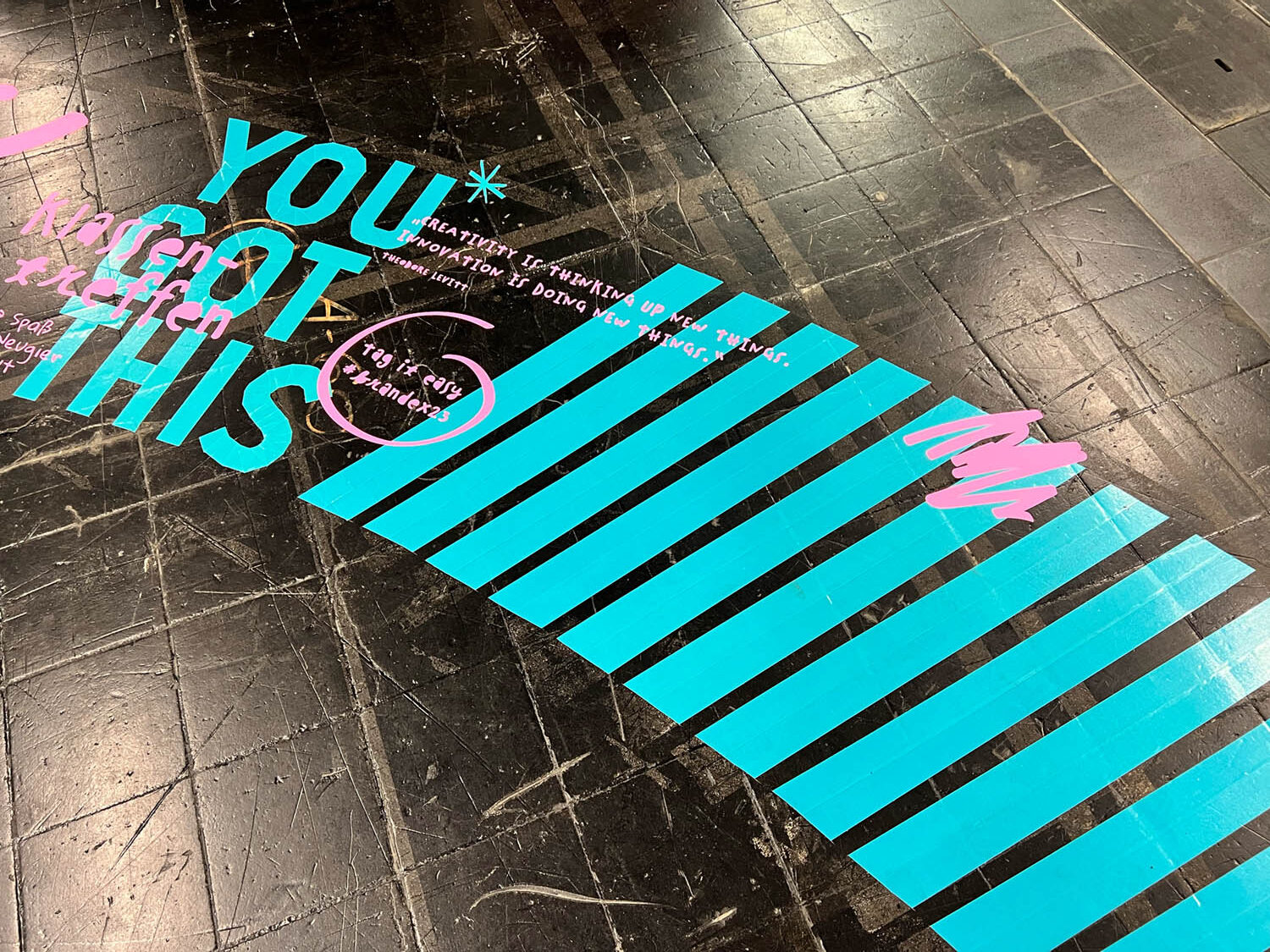 Die temporären Tape-Art-Flächen reagierten auf Inhalte, Laufwege und Atmosphäre und zeigten, wie Bodengestaltung als aktiver Teil von Messe- und Eventkommunikation eingesetzt werden kann.