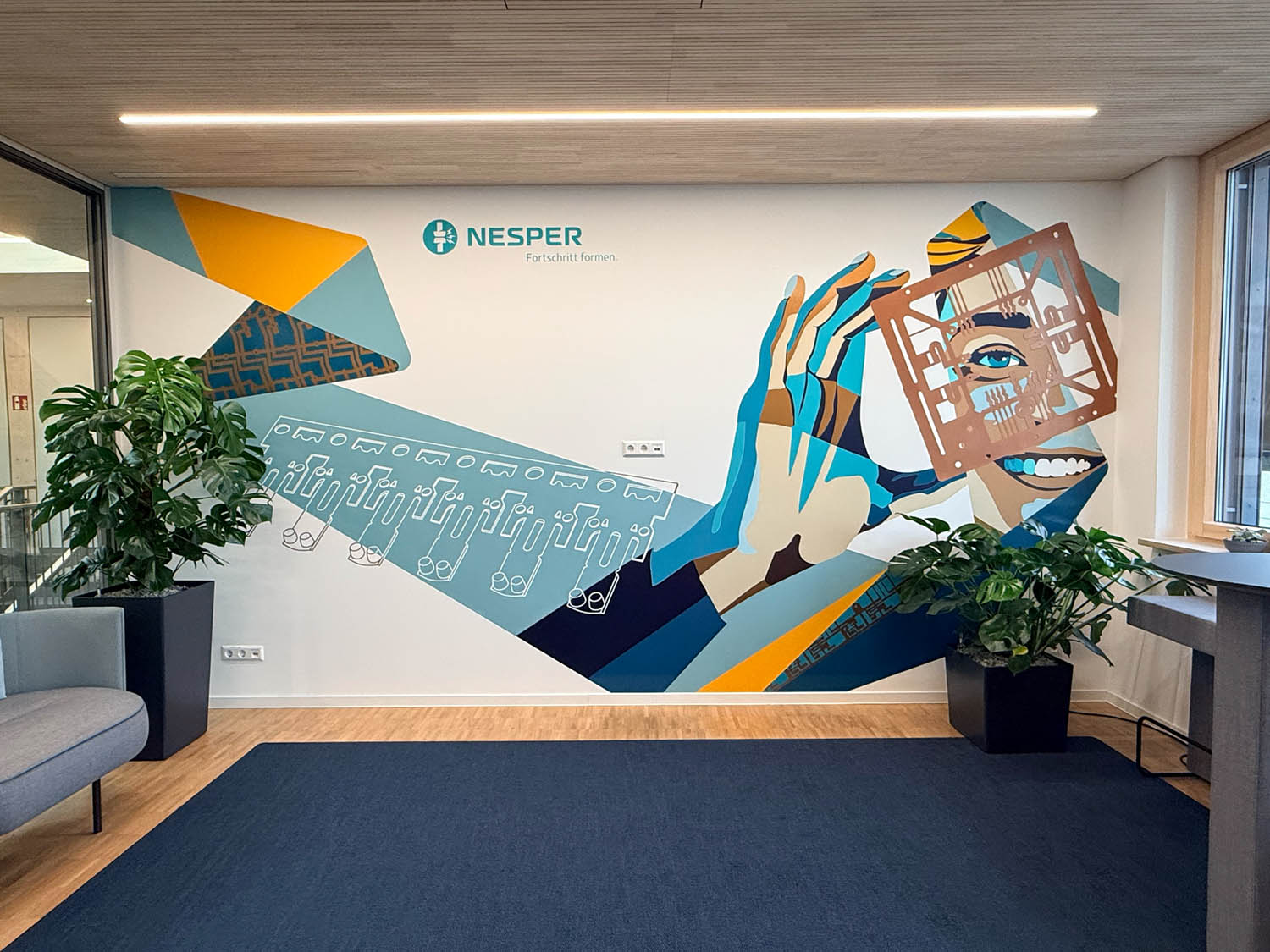 So entstand eine Corporate Wall, die Qualität, Fortschritt und Menschlichkeit gleichermaßen transportiert – und Besucher:innen unmittelbar erleben lässt, wofür Nesper steht.