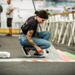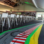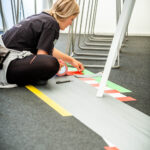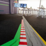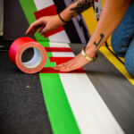 Ein zentrales Element der temporären Raumgestaltung war der Boden: Der Teppichboden wurde vor Ort jedes Mal neu inszeniert. Mit Tape Art griffen wir die stilistischen Merkmale der DTM auf und übersetzten sie abstrakt in eine Rennstrecke. Typische Reifenspuren ergänzten das Motiv – ein Effekt, den wir mit Acrylfarbe erzeugten. So entstand eine dynamische Bodengestaltung, die Bewegung, Geschwindigkeit und Motorsport unmittelbar erlebbar machte.