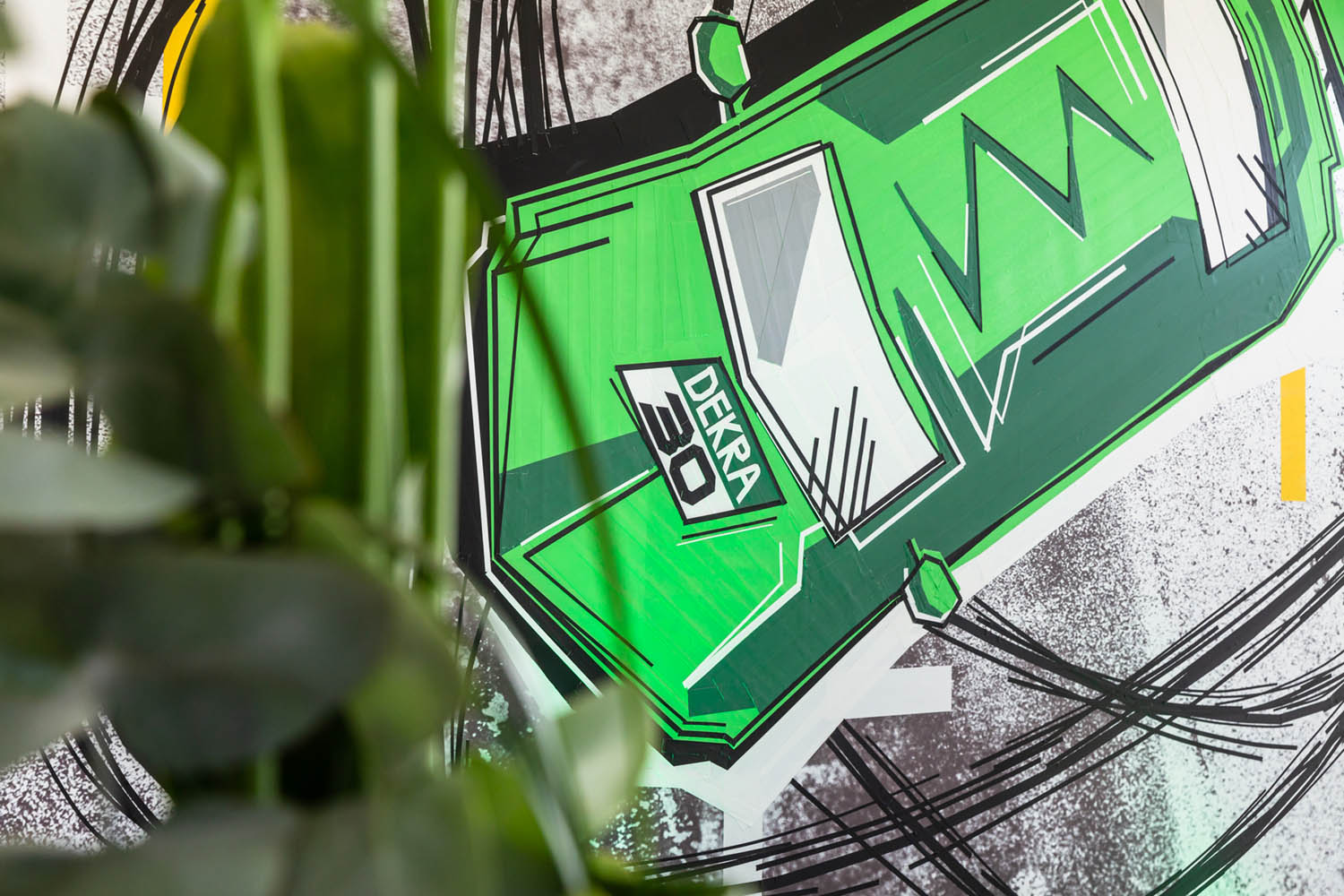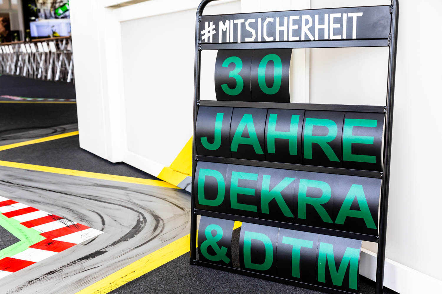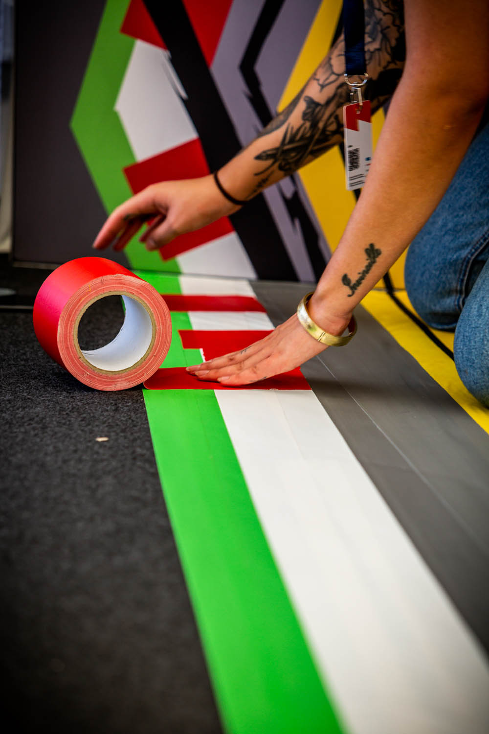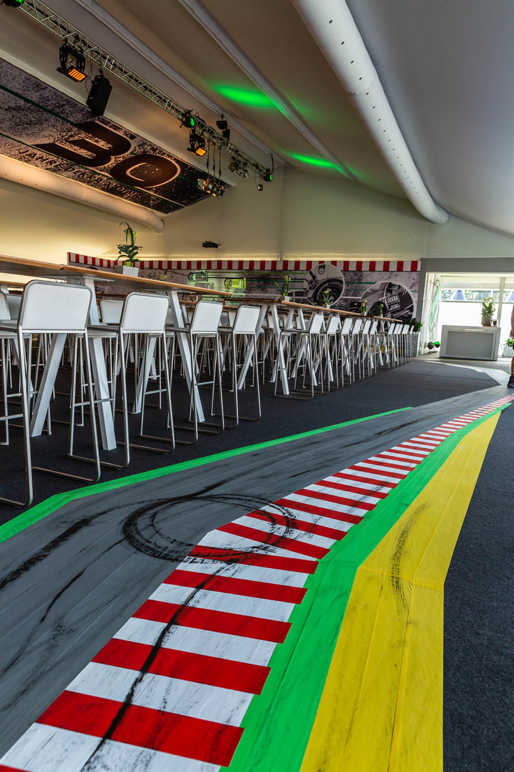 Ein zentrales Element der temporären Raumgestaltung war der Boden: Der Teppichboden wurde vor Ort jedes Mal neu inszeniert. Mit Tape Art griffen wir die stilistischen Merkmale der DTM auf und übersetzten sie abstrakt in eine Rennstrecke. Typische Reifenspuren ergänzten das Motiv – ein Effekt, den wir mit Acrylfarbe erzeugten. So entstand eine dynamische Bodengestaltung, die Bewegung, Geschwindigkeit und Motorsport unmittelbar erlebbar machte.