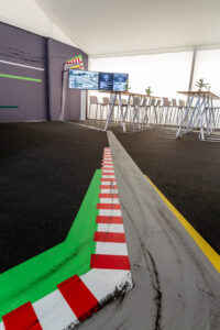 Temporäre Raumgestaltung für das DTM Hospitality Zelt von DEKRA: mobile Wand- und Deckenelemente, Tape Art Bodengestaltung und Eventdesign by DUMBO AND GERALD