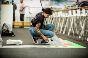 Temporäre Raumgestaltung für das DTM Hospitality Zelt von DEKRA: mobile Wand- und Deckenelemente, Tape Art Bodengestaltung und Eventdesign by DUMBO AND GERALD