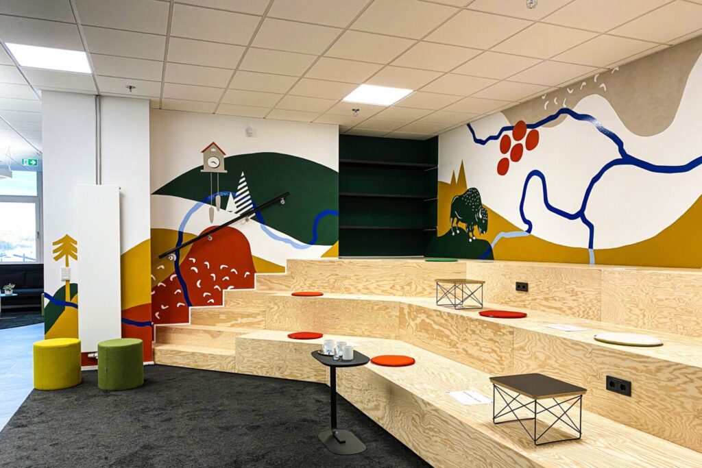 Wir gestalten großflächige Wandarbeiten für Unternehmen. Mit Tape Art, Illustration, Typografie, Wandfarbe und Mixed Media machen wir Marken im Raum erlebbar. Corporate Walls schaffen Orientierung, Atmosphäre und Identität – für Mitarbeitende, Besucher:innen und Kund:innen.