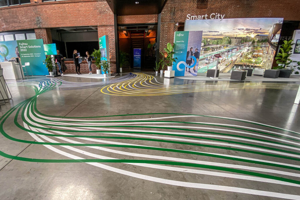 Wir gestalten Bodenflächen als eigenständiges Gestaltungselement. Mit Tape Art, Folie, Farbe oder Mixed Media entstehen temporäre Inszenierungen, die Aufmerksamkeit erzeugen, Räume strukturieren und Themen sichtbar machen – von Messehallen bis zu Events und öffentlichen Räumen.
