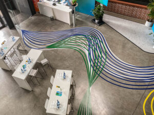 Tape Art Bodengestaltung für Fujitsu Smart Solutions: geschwungene Linien als visuelle Verbindung von Digitalisierung, Wachstum und Vernetzung. By DUMBO AND GERALD