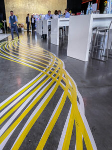 Tape Art Bodengestaltung für Fujitsu Smart Solutions: geschwungene Linien als visuelle Verbindung von Digitalisierung, Wachstum und Vernetzung. By DUMBO AND GERALD