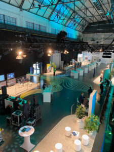 Tape Art Bodengestaltung für Fujitsu Smart Solutions: geschwungene Linien als visuelle Verbindung von Digitalisierung, Wachstum und Vernetzung. By DUMBO AND GERALD