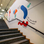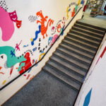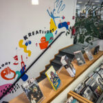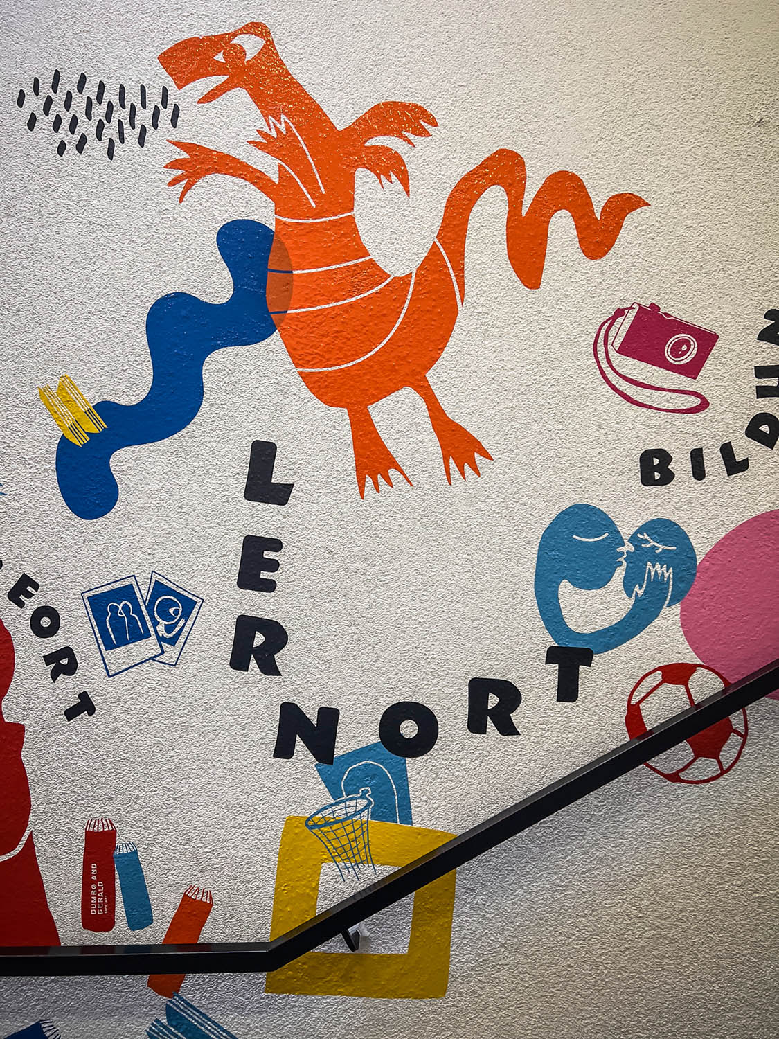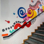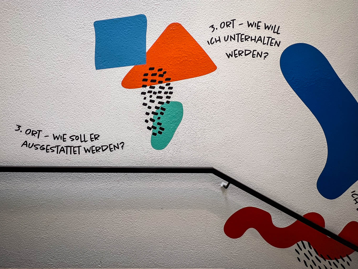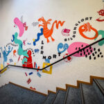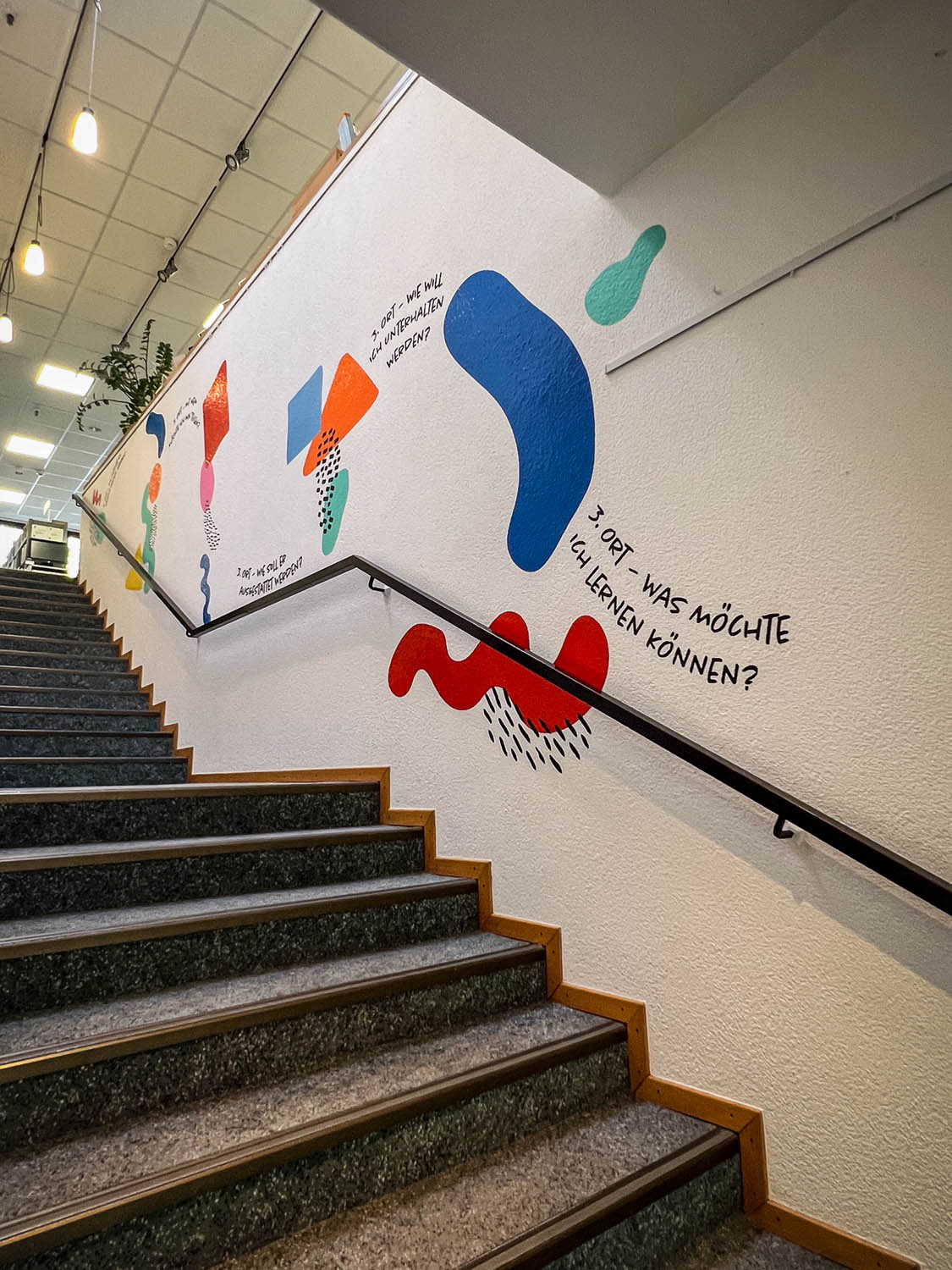 Auf der einen Seite des Treppenaufgangs gestalteten wir eine Reihe von Schlüsselbegriffen, die den Dritten Ort beschreiben: Erlebnisort, Kulturort, Lernort, Serviceort, Bildungsort, Begegnungsort und Kreativort. Diese Begriffe wurden durch Charaktere und grafische Elemente ergänzt, die die Vielfalt und Offenheit des Ortes widerspiegeln.