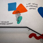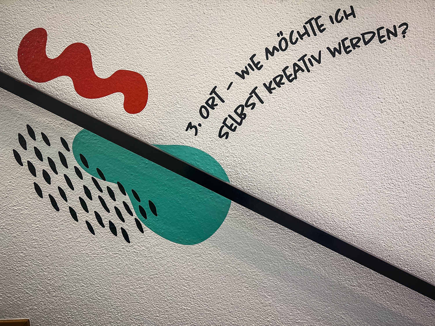 Die gegenüberliegende Seite war als Mitmach-Galerie angelegt. In klar definierten Weißräumen konnten Besucher:innen ihre Gedanken, Wünsche und Ideen festhalten – etwa zu Fragen wie: Was kann ich an einem Dritten Ort tun? Mit wem möchte ich ihn teilen? Wie will ich lernen oder kreativ werden? So wurde die Tape Art zur aktiven Kommunikationsfläche.