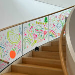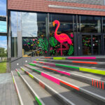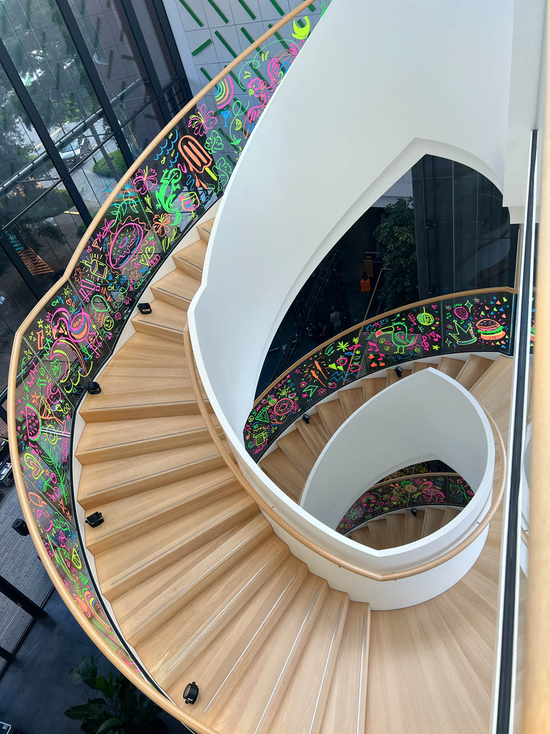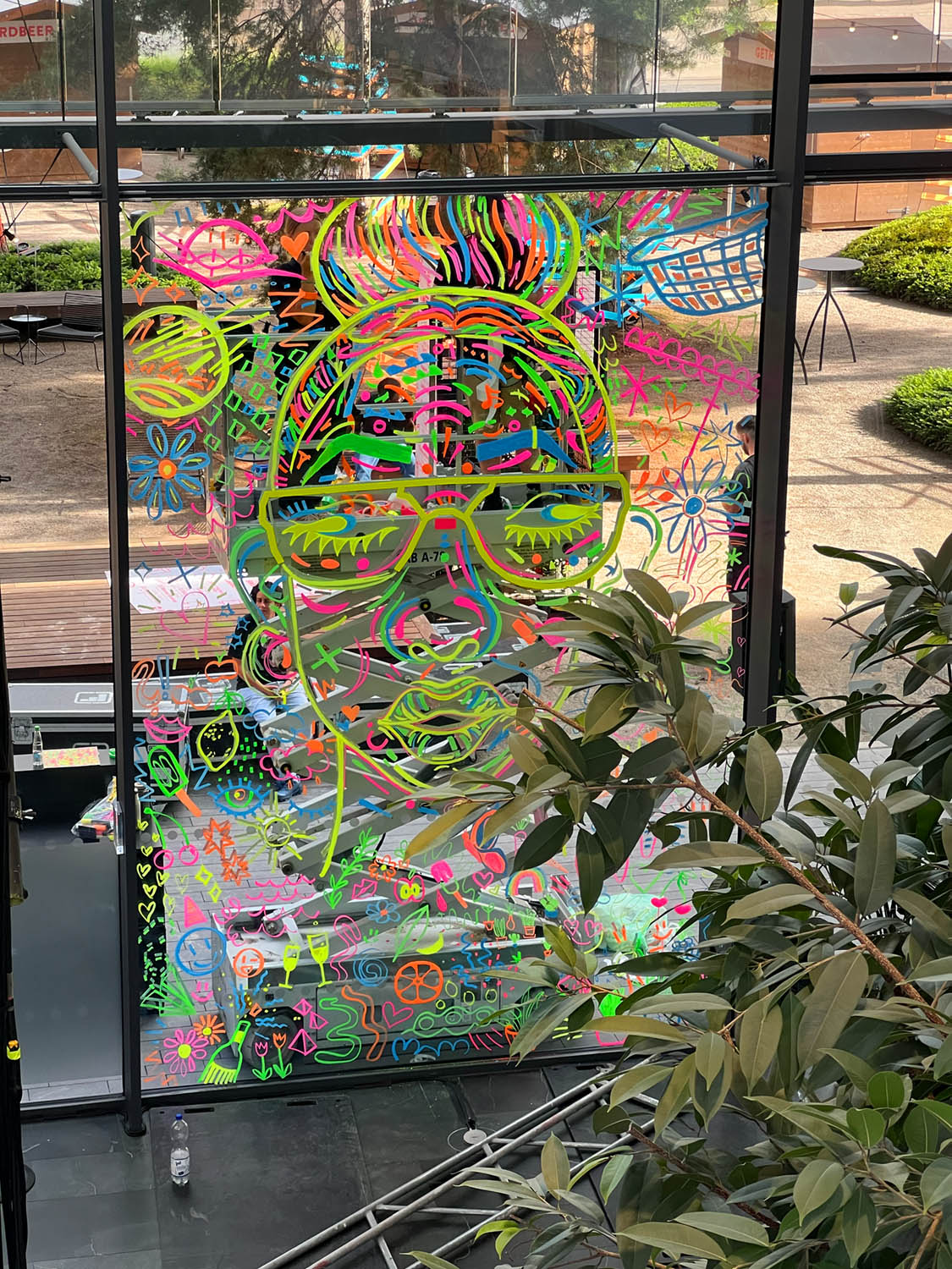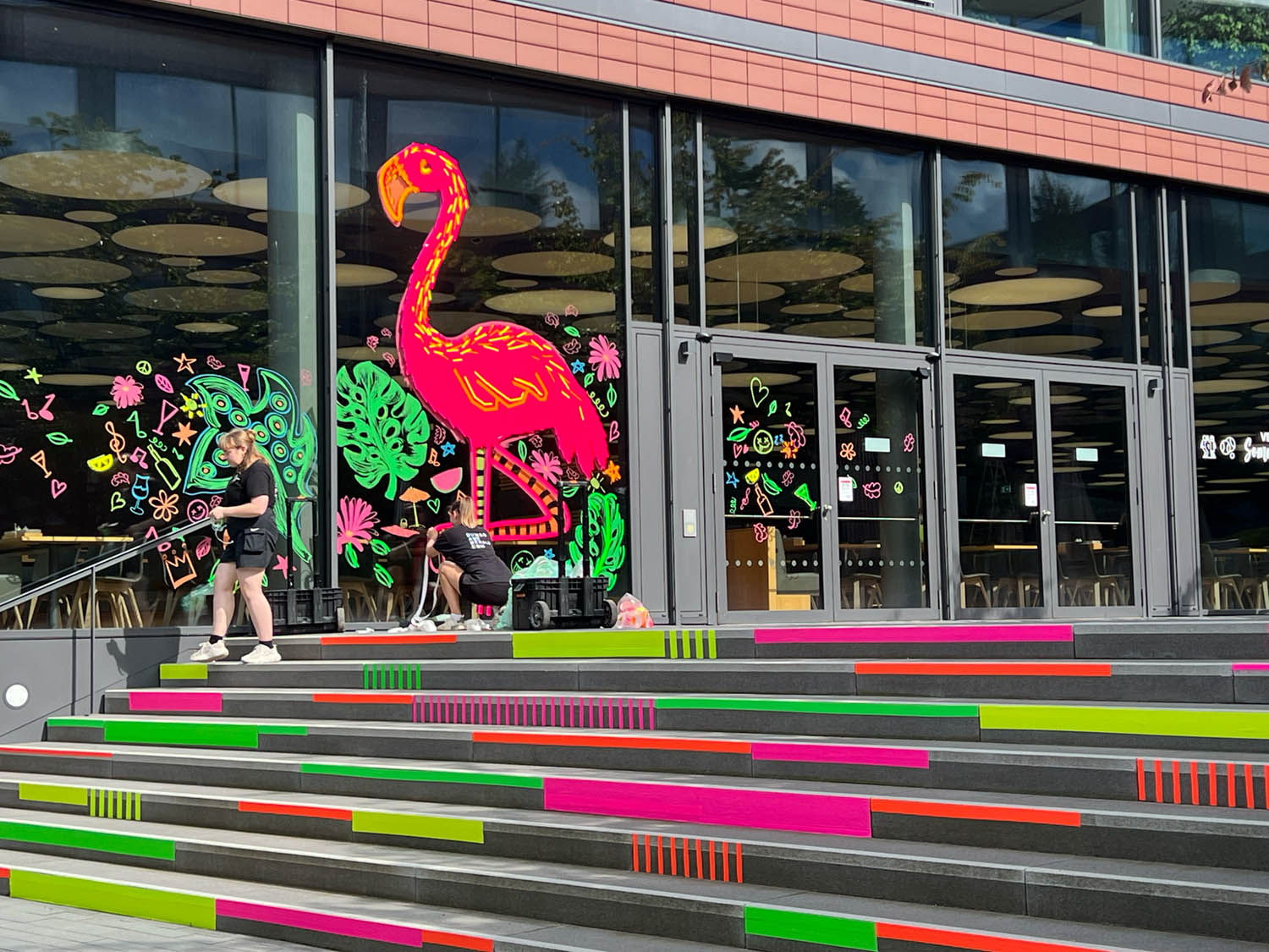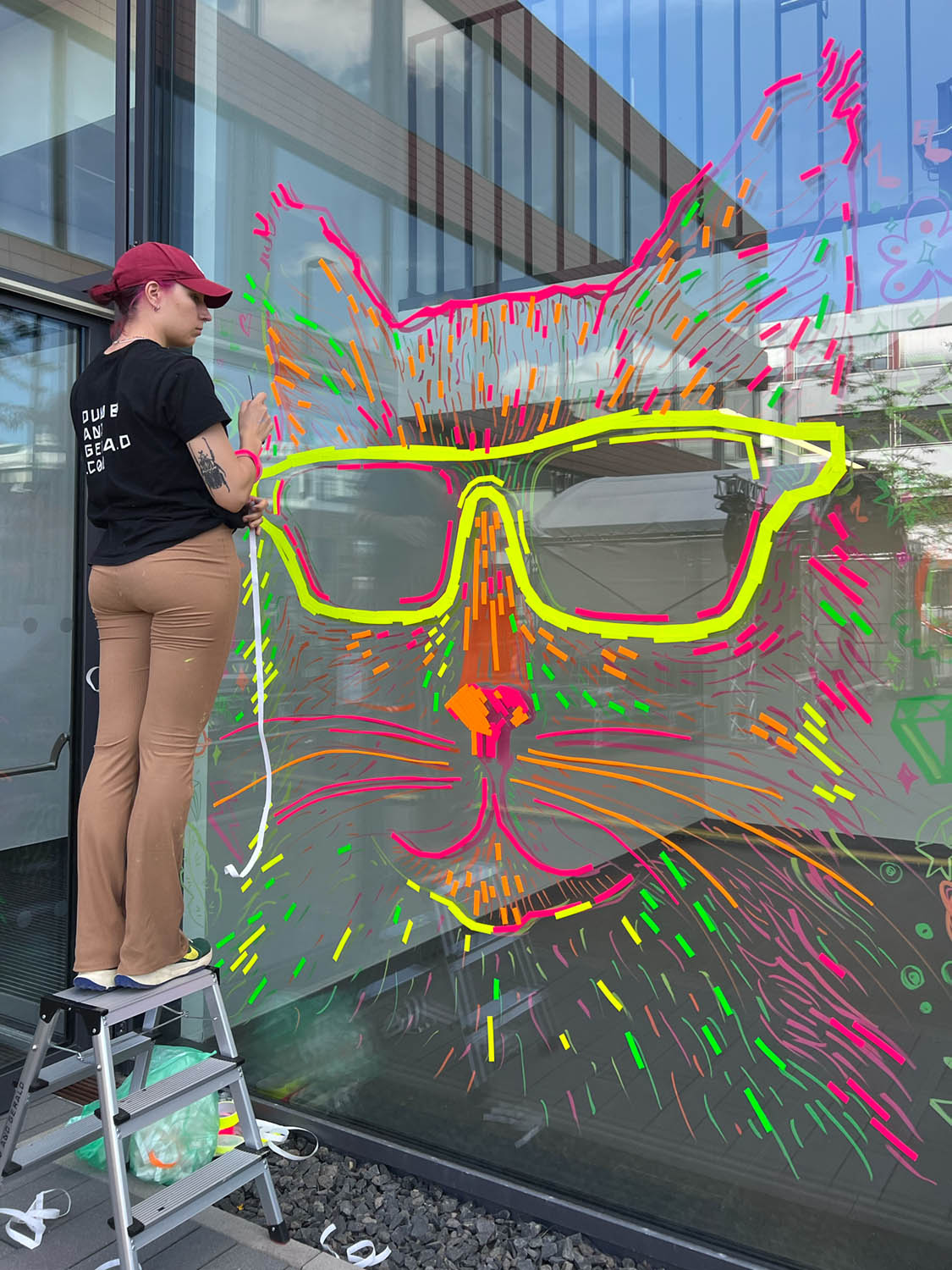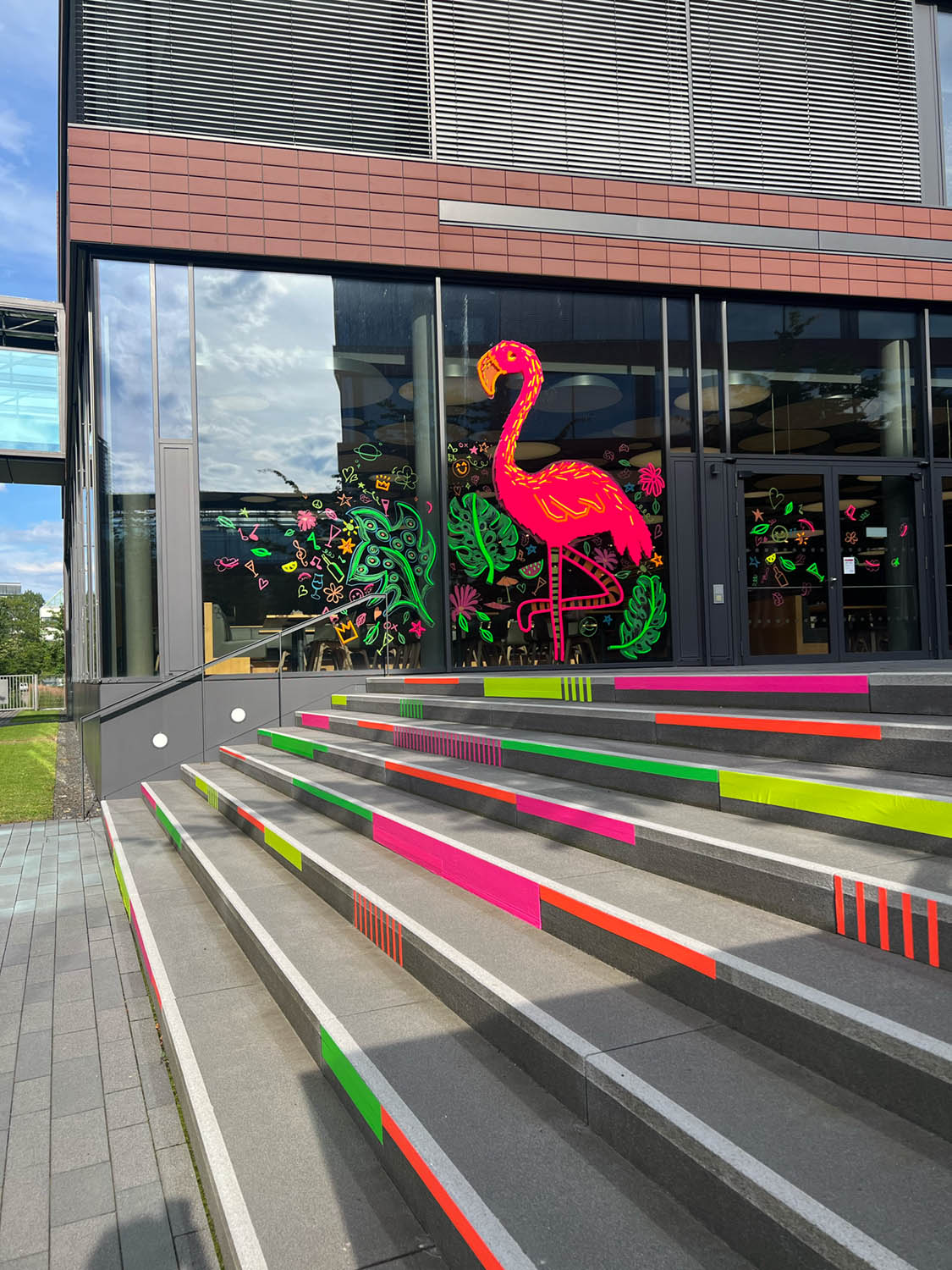Unsere Aufgabe: eine temporäre, fröhliche und aufmerksamkeitsstarke Gestaltung, die das Sommerfest visuell begleitet und die Architektur des Standorts einbezieht. Mit Neon Tape Art setzten wir farbige Akzente auf Glasfassaden, Treppenbereiche und weitere geeignete architektonische Flächen. Ergänzend kamen Neon-Kreidestifte zum Einsatz, um die Motive filigran zu erweitern und ihnen eine spielerische Leichtigkeit zu geben.
