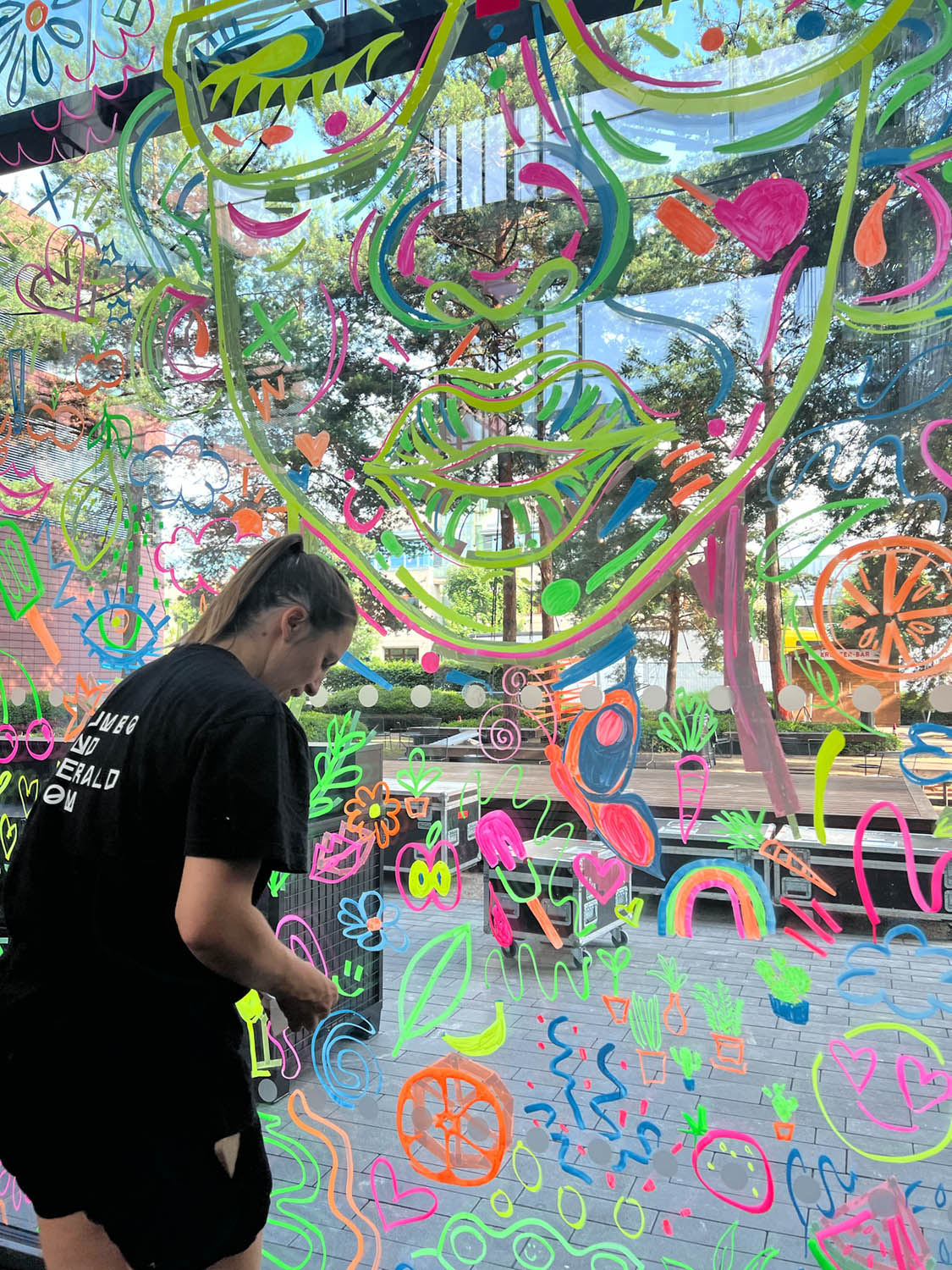 Die Gestaltung entstand direkt vor Ort und reagierte auf Raum, Licht und Blickachsen. Linien, Muster und Illustrationen entwickelten sich organisch über die Flächen und schufen eine verbindende visuelle Ebene für das gesamte Eventgelände. Trotz der intensiven Farbigkeit blieb alles rückstandslos entfernbar – ein wichtiger Aspekt für temporäre Eventformate.