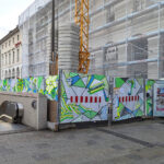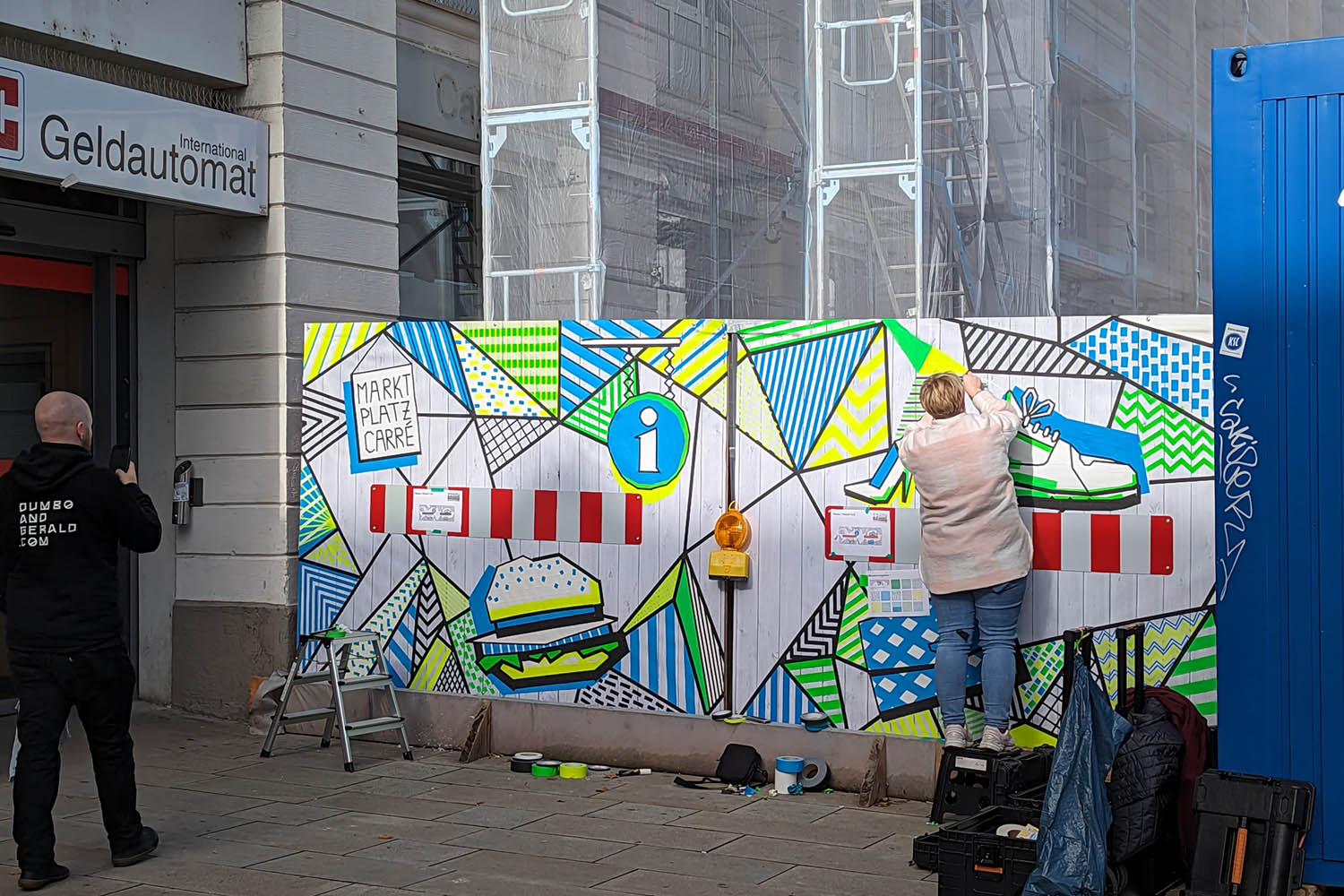 Ziel war es, die Baustelle nicht nur funktional abzugrenzen, sondern sie als temporären Raum für Kunst und Kommunikation zu nutzen. In leuchtenden Neonfarben entwickelten wir eine Bildwelt, die das Quartier Marktplatz Carré und seinen vielfältigen Nutzungsmix sichtbar macht.