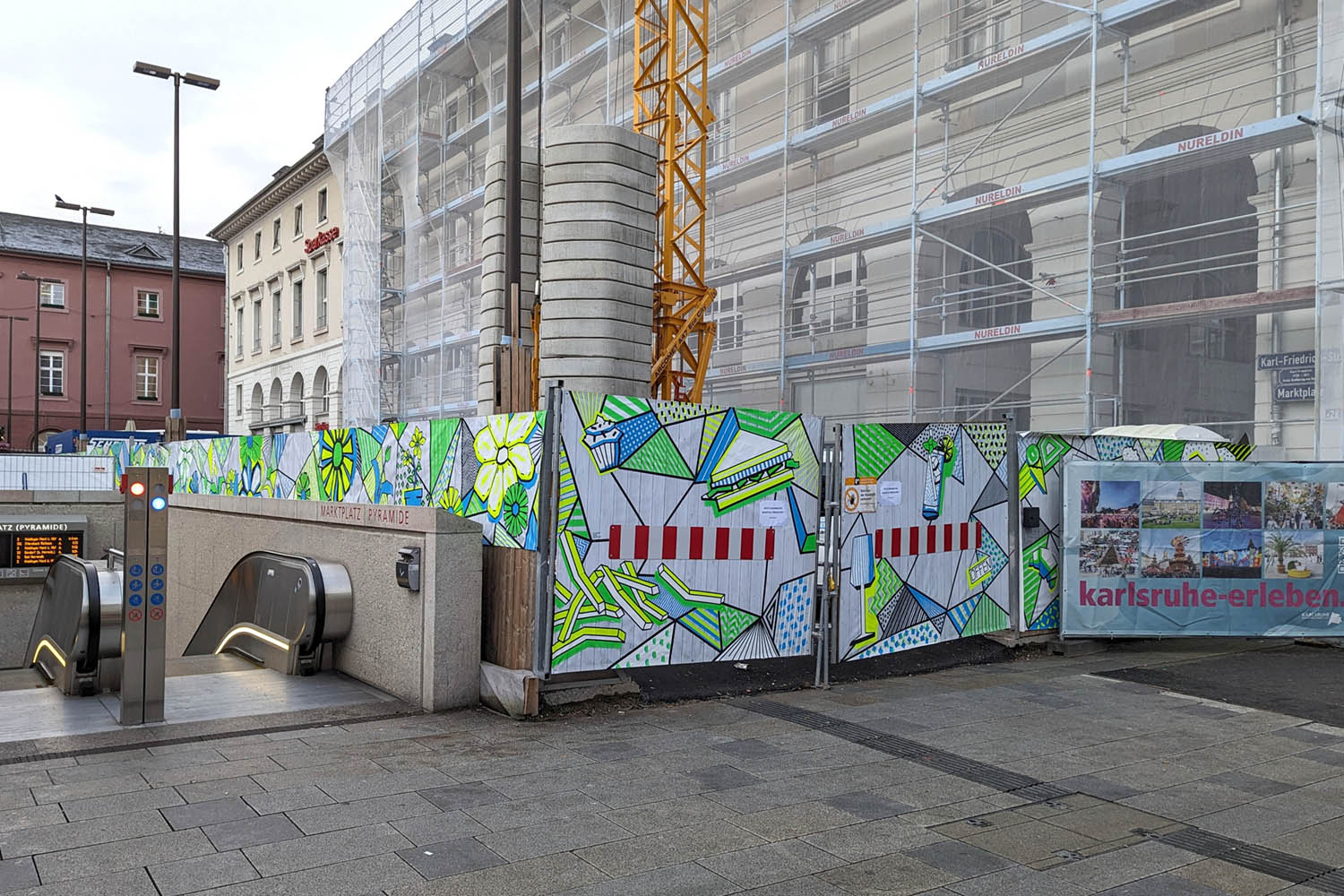 Im Rahmen des Baustellenmarketings zur Neugestaltung der Kaiserstraße gestalteten wir einen rund 50 Meter langen Bauzaun am Karlsruher Marktplatz mit Tape Art. Die Maßnahme entstand im Auftrag des Citymarketings der KME Karlsruhe Marketing und Event GmbH.