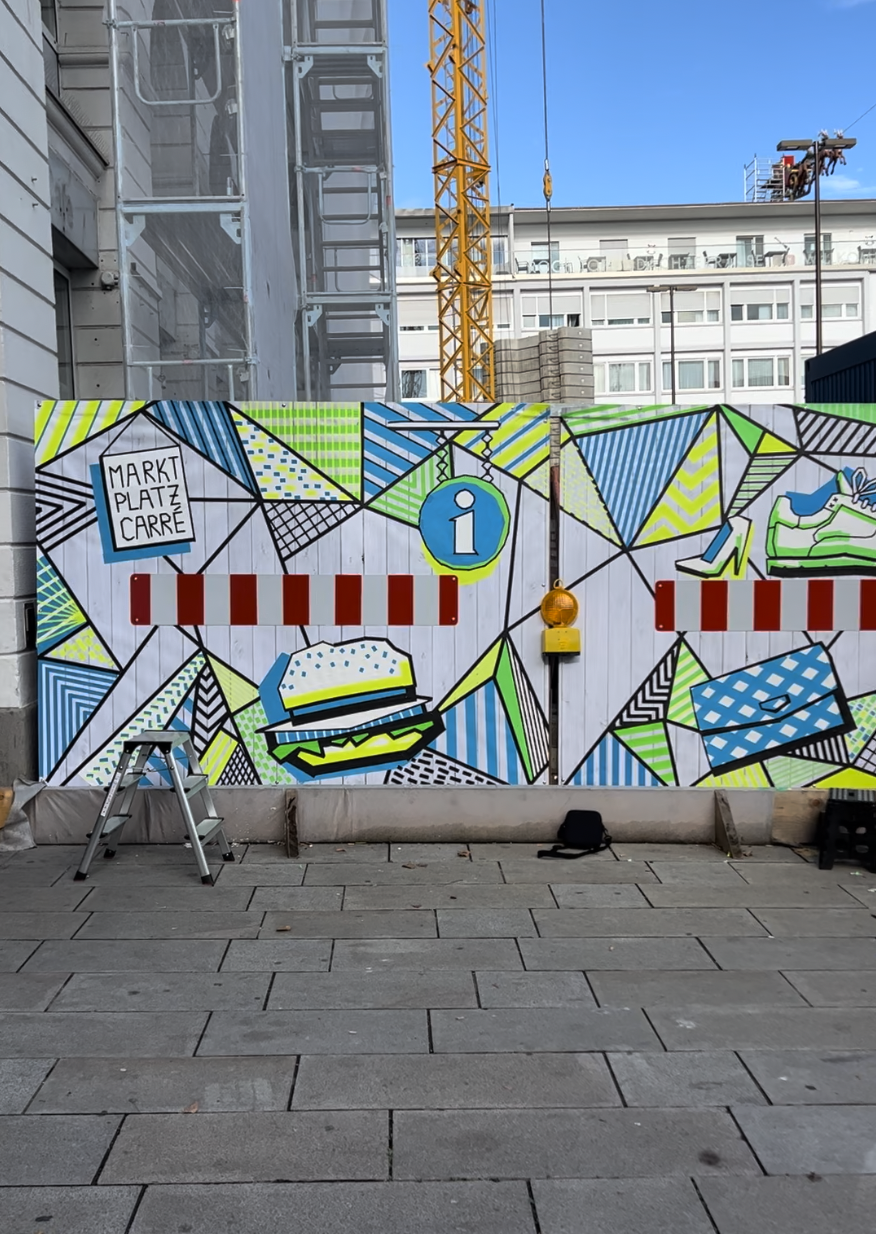 Ziel war es, die Baustelle nicht nur funktional abzugrenzen, sondern sie als temporären Raum für Kunst und Kommunikation zu nutzen. In leuchtenden Neonfarben entwickelten wir eine Bildwelt, die das Quartier Marktplatz Carré und seinen vielfältigen Nutzungsmix sichtbar macht.
