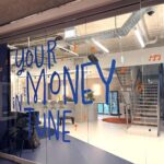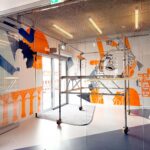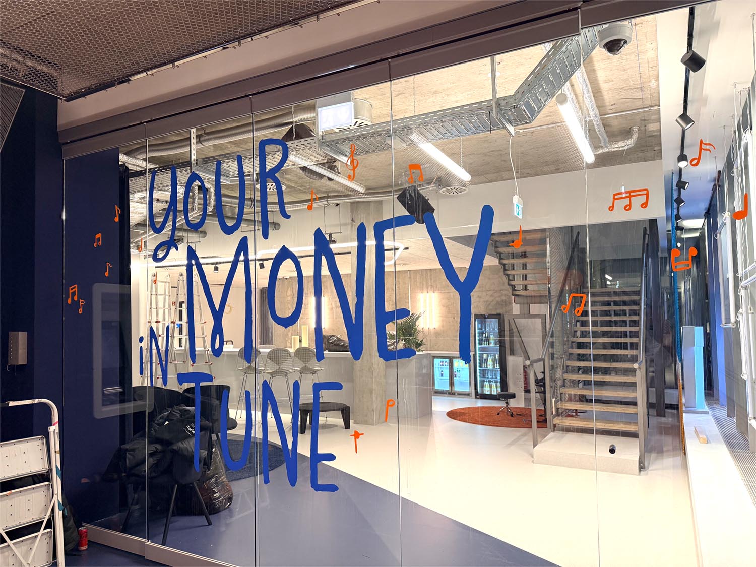Der Clou: Kunden, die nach Geschäftsschluss im SB-Bereich Geld abheben, hören laute Musik – selbst ausgewählt von Rock bis Klassik. Doch das ist nicht alles: Schwarzlicht lässt das Neon-Orange im Wandbild leuchten und entfaltet so eine ganz neue Wirkung. Ein Effekt, der die Wände lebendig macht und Besucher überrascht.