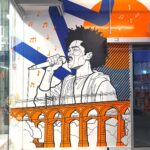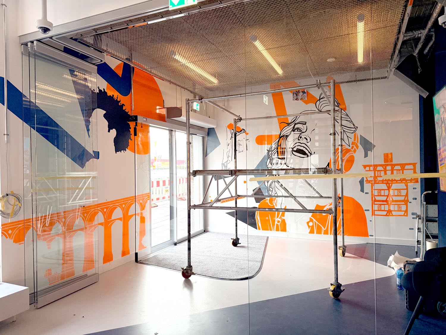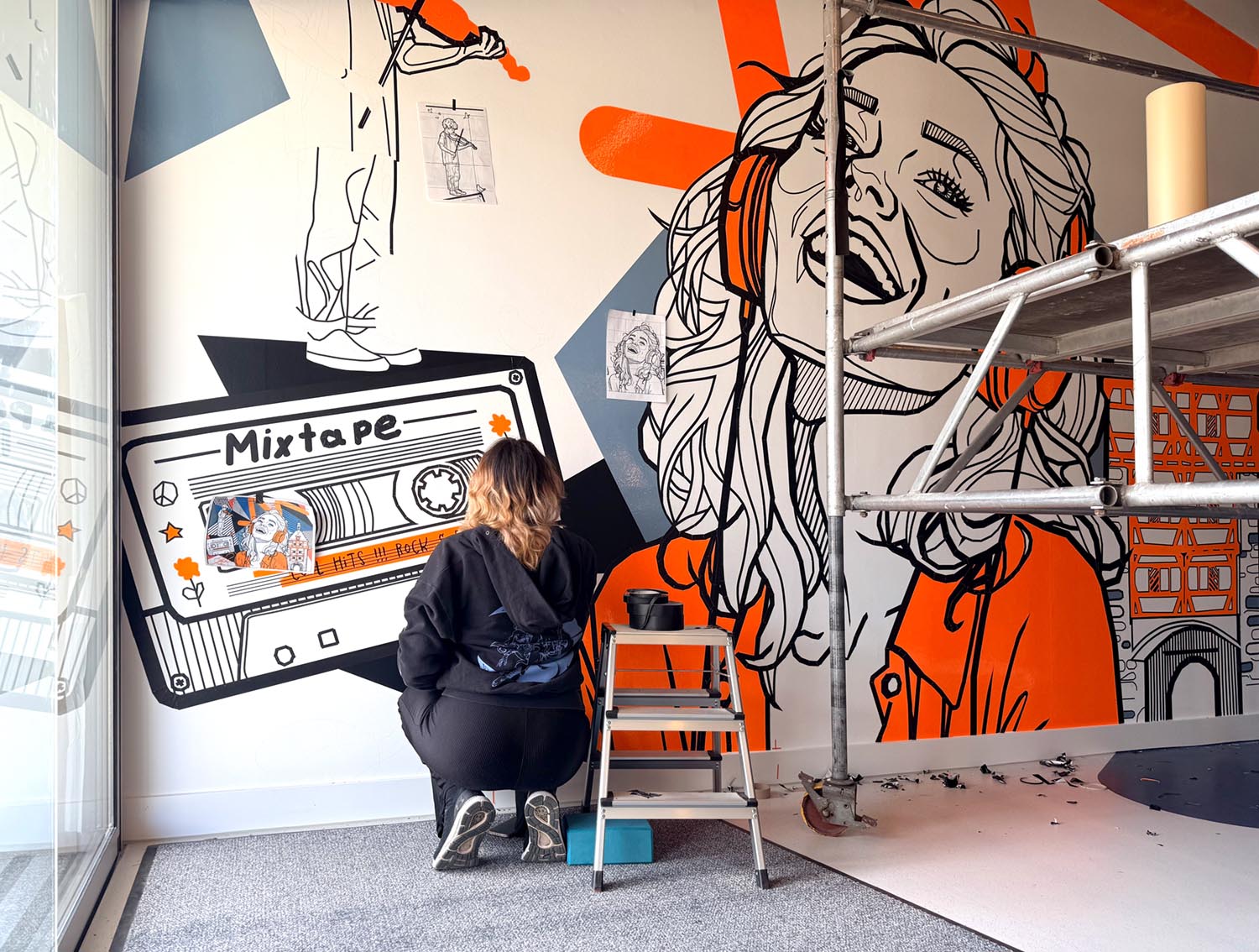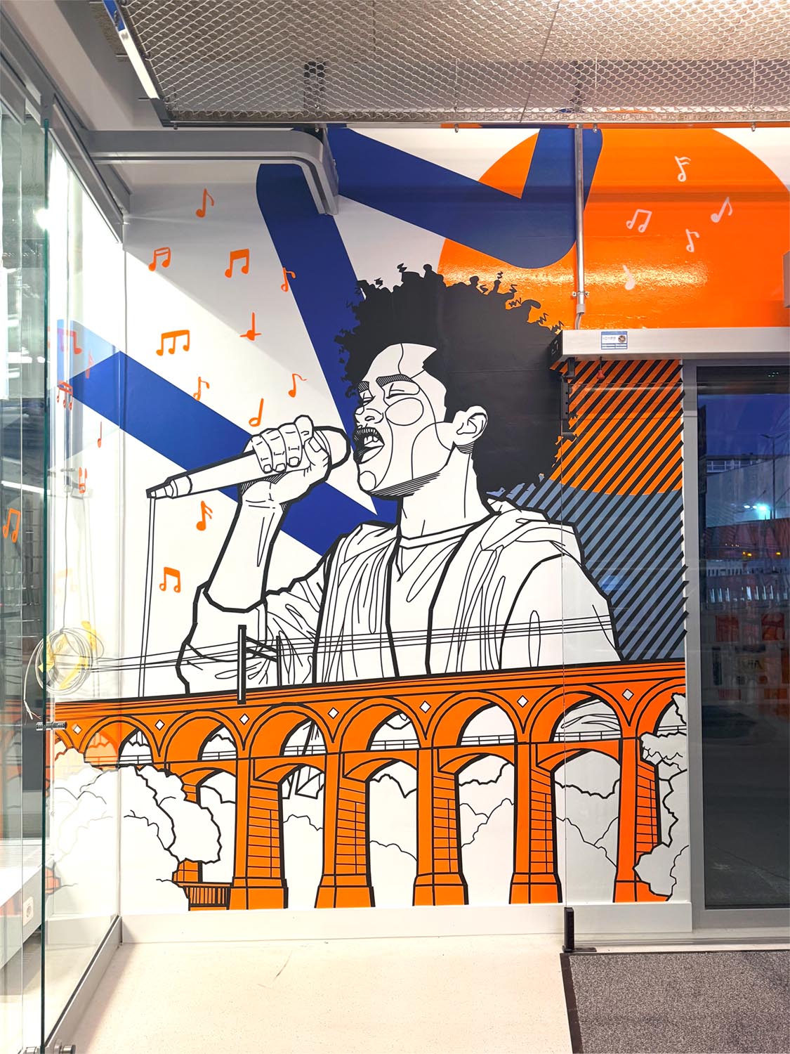 Für die VR-Bank in Bietigheim-Bissingen gestalteten wir den Vorraum mit Klebeband und Klebefolie – eine Corporate Wall, mit lokalem Bezug und Musik-Feeling. Im Zentrum stehen Porträts und Motive, die in feinen schwarzen Linien aus Klebeband umgesetzt wurden, darunter lokale Wahrzeichen wie das Untere Tor und das Viadukt. Die Flächen im Hintergrund und leuchtenden Akzente orientieren sich an der Corporate Farbwelt der Volksbank: Blau und Orange.