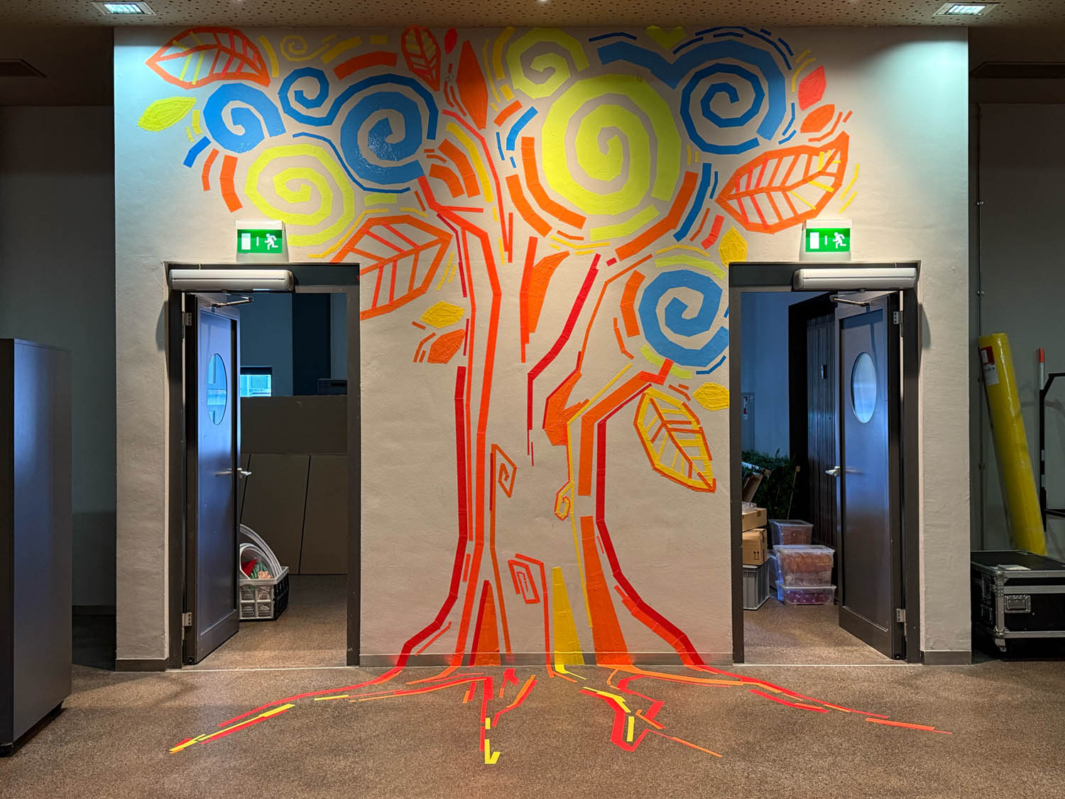 Das Projekt zeigt, wie temporäre Wandgestaltung mit Tape Art Events atmosphärisch aufwerten und zugleich Orientierung schaffen kann.