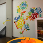 Passend zum sommerlichen Anlass entwickelten wir abstrakte florale Motive, die sich über mehrere Wandflächen erstreckten. Die farbigen Tape-Art-Elemente schufen eine lebendige Atmosphäre und gaben den Räumen einen neuen, spielerischen Flair, ohne dabei mit der übrigen Dekoration zu konkurrieren.