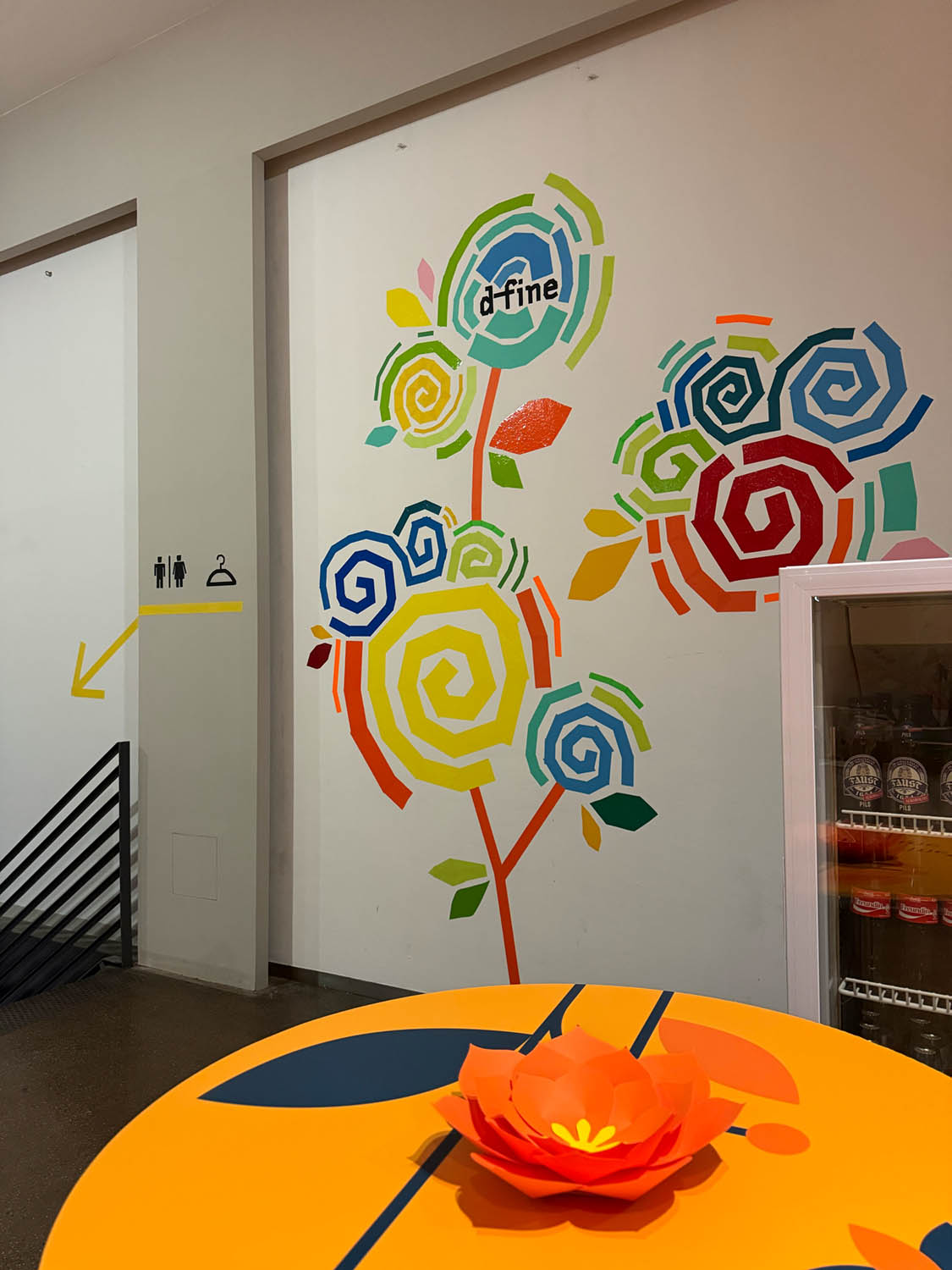 Für das Sommerfest der Firma dfine gestalteten wir die Räumlichkeiten mit Tape Art und verliehen den zuvor neutralen, weißen Wänden einen eigenständigen Charakter. Ziel war es, das bestehende Eventdesign – mit Balloninstallationen, XXL-Blumen und weiteren Raumelementen – visuell zu ergänzen und räumlich zu verbinden.