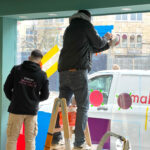 Die Umsetzung erfolgte anschließend als Teambuilding-Workshop mit Führungskräften eines regionalen Automobilunternehmens. Unter unserer Anleitung brachten die Teilnehmenden die Klebefolien selbst auf die Glasflächen und setzten den Entwurf gemeinsam um.