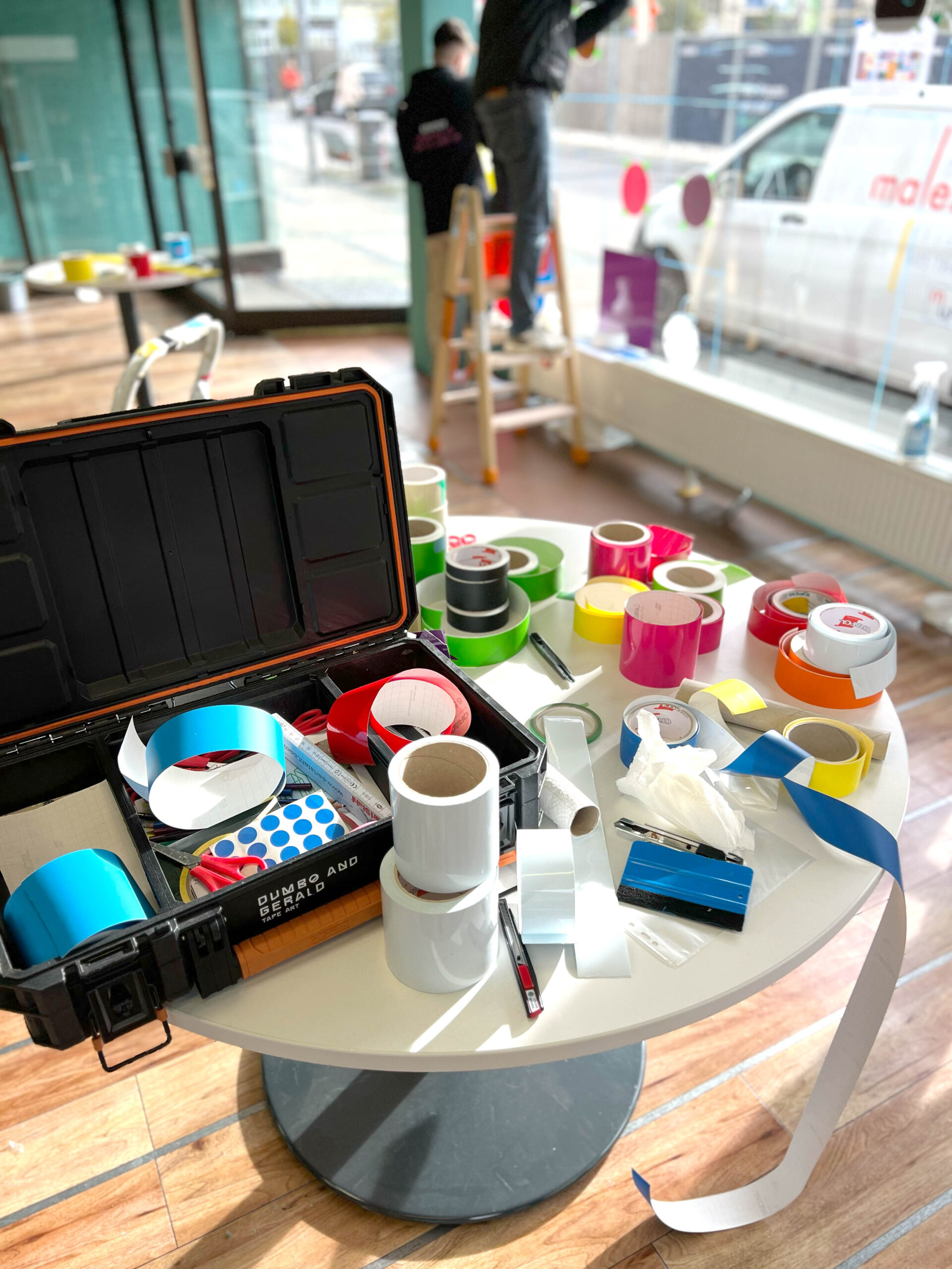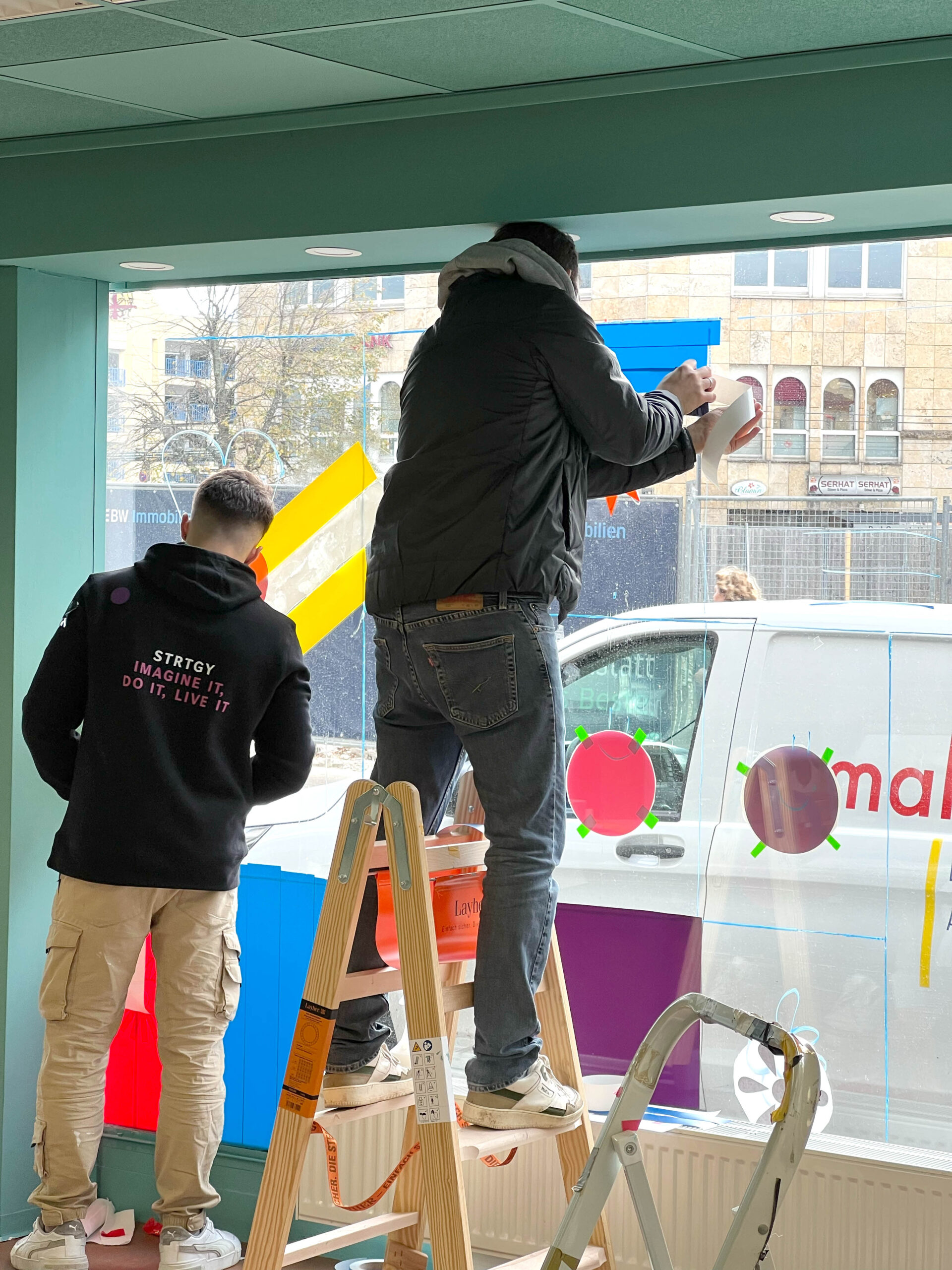 Anstelle einer vollständig blickdichten Lösung entschieden wir uns bewusst für eine künstlerische Sichtschutz-Gestaltung mit Tape Art. Ziel war eine lockere, transparente Gestaltung, die Einblicke zulässt, ohne den Raum preiszugeben. Dafür entwickelten wir einen Entwurf, der gemeinsam mit der Bürgerstiftung und den beteiligten Architekt:innen abgestimmt wurde.