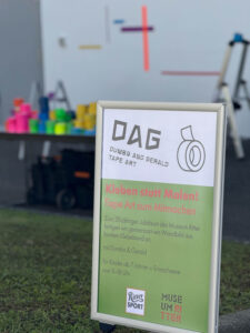 Tape Art Workshop von DUMBO AND GERALD zum 20-jährigen Jubiläum des Museum Ritter: partizipatives Fassadenkunstwerk mit Besucher:innen jeden Alters.