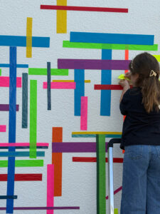 Tape Art Workshop von DUMBO AND GERALD zum 20-jährigen Jubiläum des Museum Ritter: partizipatives Fassadenkunstwerk mit Besucher:innen jeden Alters.