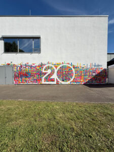 Tape Art Workshop von DUMBO AND GERALD zum 20-jährigen Jubiläum des Museum Ritter: partizipatives Fassadenkunstwerk mit Besucher:innen jeden Alters.